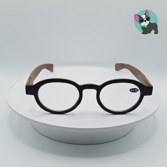 Reading glasses with a retro plastic frame and round, clear lenses. Shiny metal temples with plastic tips appeal to both men and women. The lightweight plastic frame ensures high wearing comfort and adapts perfectly to the face. The lenses feature UV400 technology to protect against harmful sun rays. This model is also available in various lens strengths.